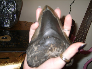 This is my Megalodon tooth. I found it on one of my research missions. By ‘I’ I mean my husband and by ’found’ and ‘research mission’ I mean bought on Ebay, and I suppose in the spirit of full disclosure by ‘tooth’ I mean fossil. But it’s still awesome!
